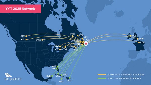 The map below, from St. John's Airport, shows the direct flights into St. John's (for 2025). Coming from further afield, it's usual to connect through Toronto (YYZ), Montréal (YUL) or Halifax (YHZ). The main airlines are Air Canada (a member of Star Alliance) and West Jet.